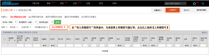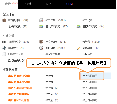 步骤五:在发货模块中点击对应的万邑通仓库后的【待上传跟踪号】