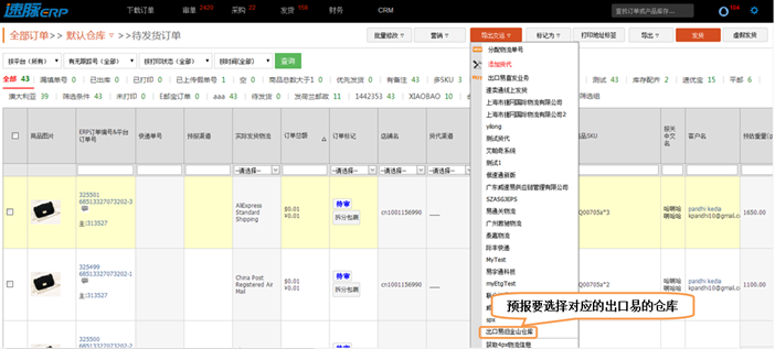 步骤四:在【导出交运】中选择万邑通仓库预报